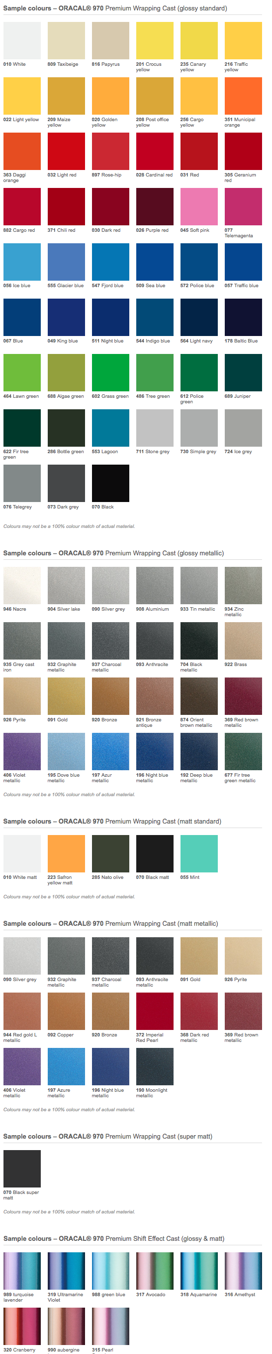 for plotting and printing. Their wide range of vinyl casts, intensecolors, metallic finishes, and specialty films provide endless job opportunities. Oracal 970RA is a premium wrapping cast vinylwrap for long-term car wrapping, superior conformability, nolamination required, 97 colors in matte, glossy & metallic finishes, & up to 6 years durability.